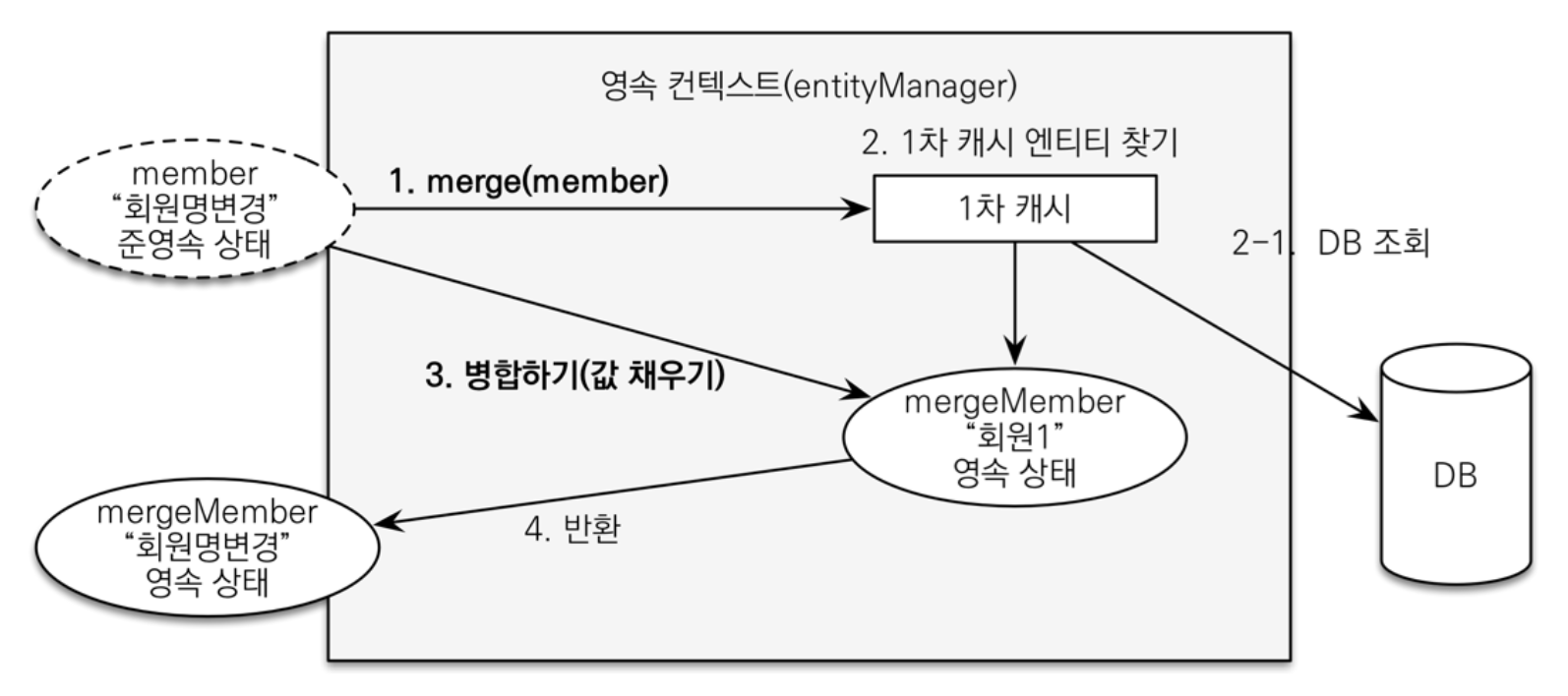 em.merge(entity): 준영속 상태의 엔티티를 다시 새로운 영속 상태의 엔티티로 반환