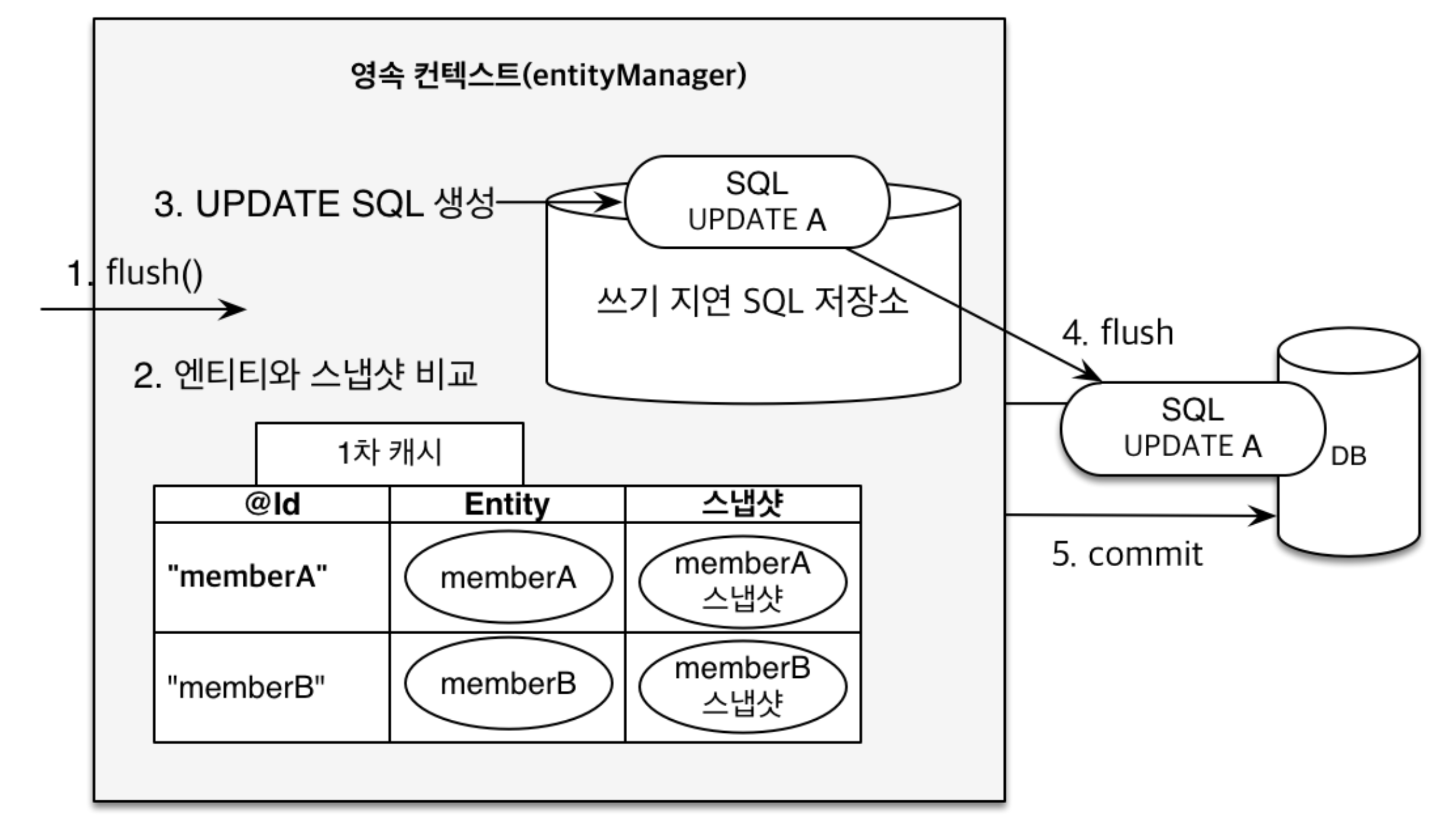 flush()호출- 1차 캐시에서 엔티티와 스냅샷을 비교하여 변경되었는지 확인 (dirty checking)