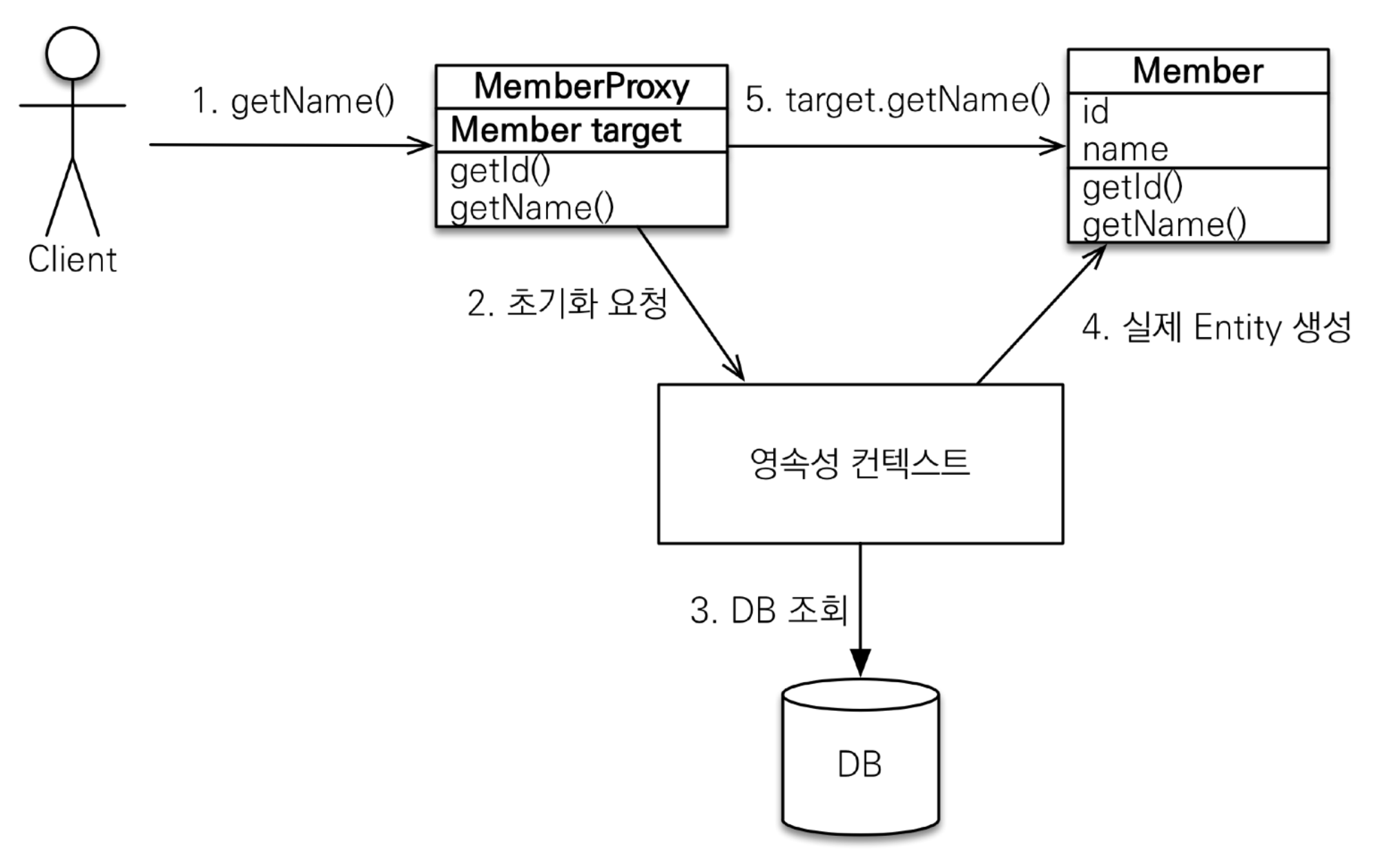 프록시 객체는 실제 엔티티 객체의 getName()을 호출해서 결과를 반환
